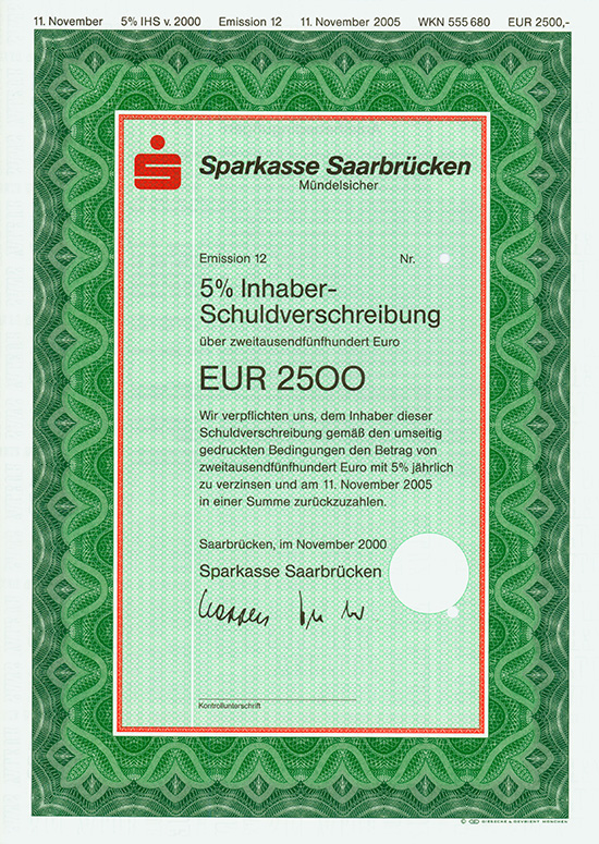 a) Saarbrücken, November 2000, Specimen einer 5 % Inhaber-Schuldverschreibung über 2.500 Euro, o. Nr., 29,7 x 21 cm, grün, rot, schwarz, KR; b) wie a), nur 5.000 Euro, rot. | ||||||||||||||||||||||||||||||||||||||||||||||||||||
