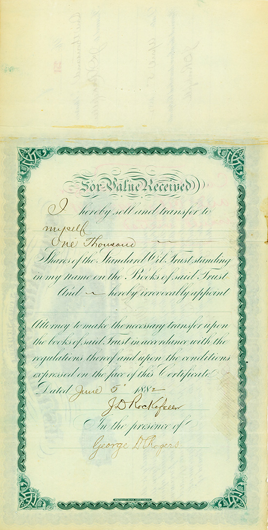 5 April 1882, 1,000 Shares of US-$ 100, #251, folds, partly creased at lower margin, vignette with Capitol, issued to John D. Rockefeller, signed by him three times: once as President, once on the stub and once on the reverse. Further signatures of Henry M. Flagler and Jabez A. Bostwick as Treasurer. Standard Oil Trust with triple Rockefeller signatures are rarities! We only know 8 of these share certificates! | ||||||||||||||||||||||||||||||||||||||||||||||||