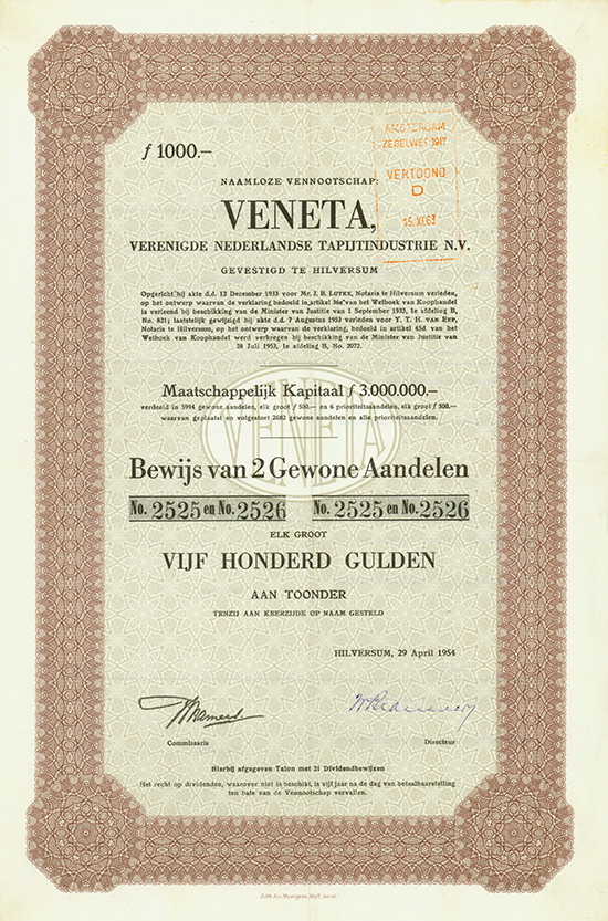 a) Hilversum, 29.04.1954, Bewijs van Gewoon Aandeel groot 500 Gulden, #4774; b) wie a), nur Bewijs van 2 Gewone Aandeelen elk groot 500 Gulden, #2525-26, Knickfalten (geviertelt). | ||||||||||||||||||||||||||||||||||||||||||||||||||||