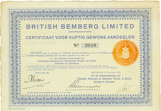 a) Amsterdam, 15 September 1929, Certificaat voor 50 Gewone Aandeelen, #2010, small tears (one up to 0.5 cm), coupons; b) Amsterdam, 18 June 1931, Certificaat voor 100 Gewone Aandeelen, #3051, tanned, coupons. | |||