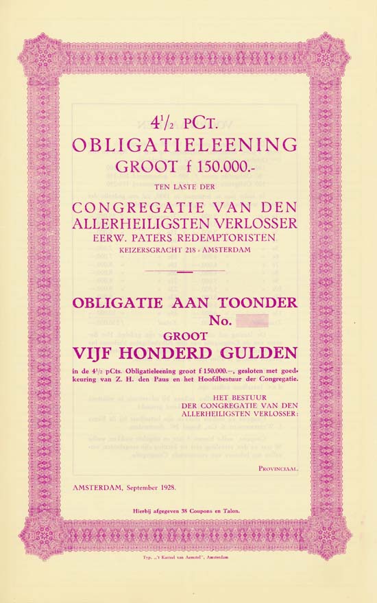 a) Amsterdam, January 1928, Unissued 5 % Obligation of 100 Gulden, no serial no., coupons; b) Amsterdam, September 1928, Unissued 4.5 % Obligation of 100 Gulden, no serial no., coupons; c) like b), but 500 Gulden. | |||