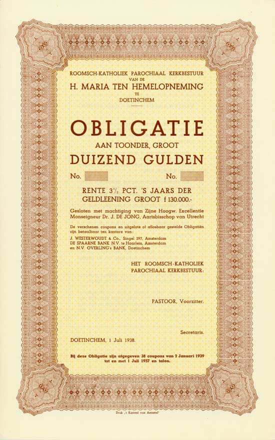 a) Doetinchem, 1 July 1938, Unissued 3.5 % Obligation of 500 Gulden, no serial no., coupons; b) like a), but #160, without signatures; c) like a), but 1,000 Gulden. | |||