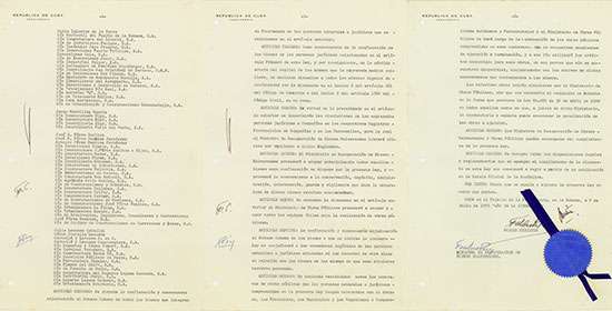 Havanna, 07.07.1959, Maschinenschriftlich verfasster Erlass über die Enteignung des gestürzten Diktators Fulgencio Batista bzw. seiner Anhänger, die sich während seiner Herrschaft unrechtmäßig bereichert hatten, 6 Seiten inklusive detaillierter Auflistung der entsprechenden Namen und betroffenen Gesellschaften, 34,5 x 22,7 cm, links Klammerlöcher, Abheftlochung, blaues papiergedecktes Siegel über blauen Seidenbändern, Original-Signaturen "Fidel Castro R" von Fidel Castro als Premierminister (Primer Ministro) und Faustino Pérez Hernández als Minister für die Rückgewinnung veruntreuter Güter (Ministro de Recuperación de Bienes Malversados), zudem je 5 weitere Signaturen "F. C." und "F. Péz" am Rand von 5 Seiten. R12! Wichtiger Hinweis: Für Käufer innerhalb der Europäischen Union werden 19 % Umsatzsteuer auf Warenwert und Provision berechnet. Die Steuer wird separat ausgewiesen und ist für in Deutschland zum Vorsteuerabzug berechtigte Käufer erstattungsfähig, sofern die gesetzlichen Voraussetzungen erfüllt sind. Die Klärung der für den Käufer geltenden Steuer- und Zollbestimmungen obliegt diesem selbst. | |||